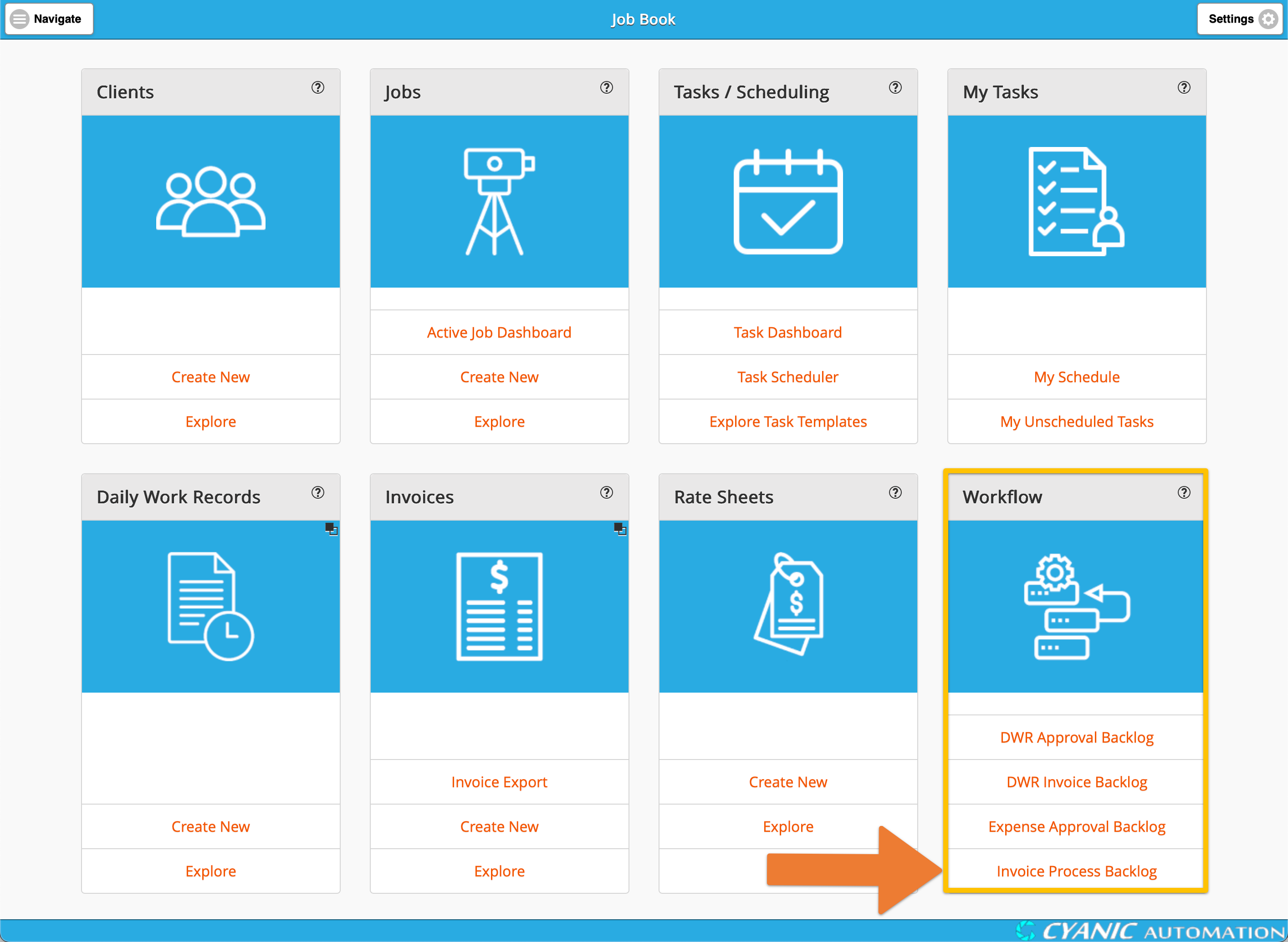 From the main dashboard, locate the Workflow card in the middle row and click Invoice Process Backlog to open the processing center.